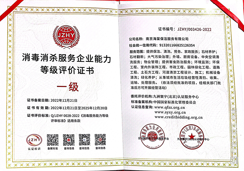 消毒消殺服務(wù)企業(yè)能力等級評價證書